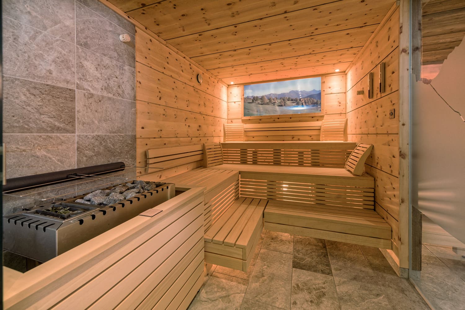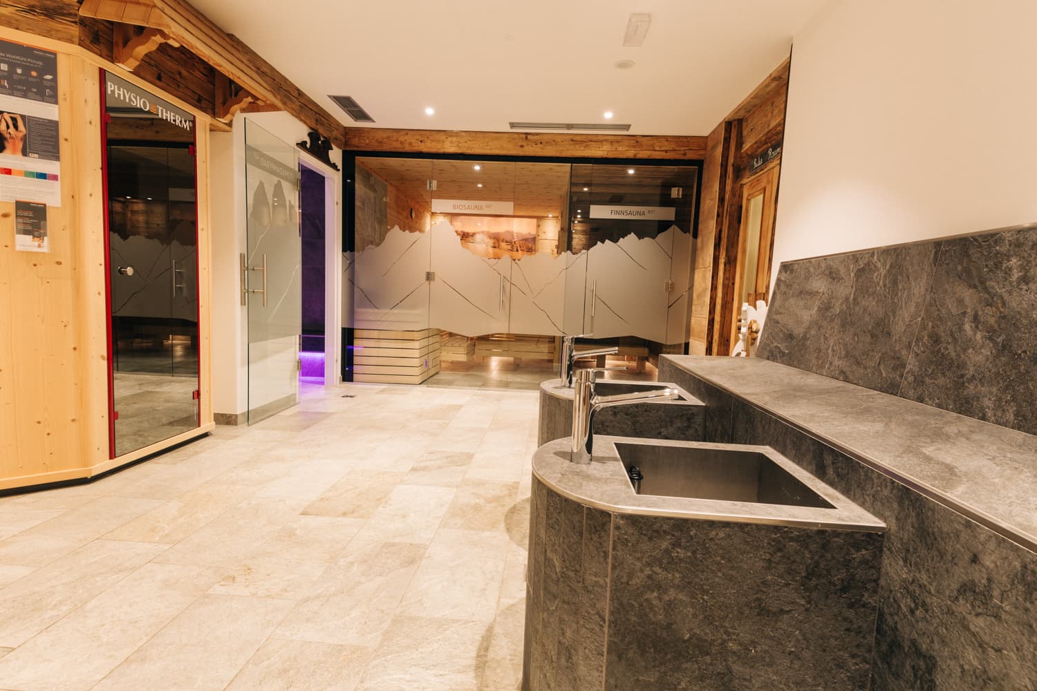 Einblick in Haus, Wellnessbereiche und die verschneite Landschaft rund um Stuls.